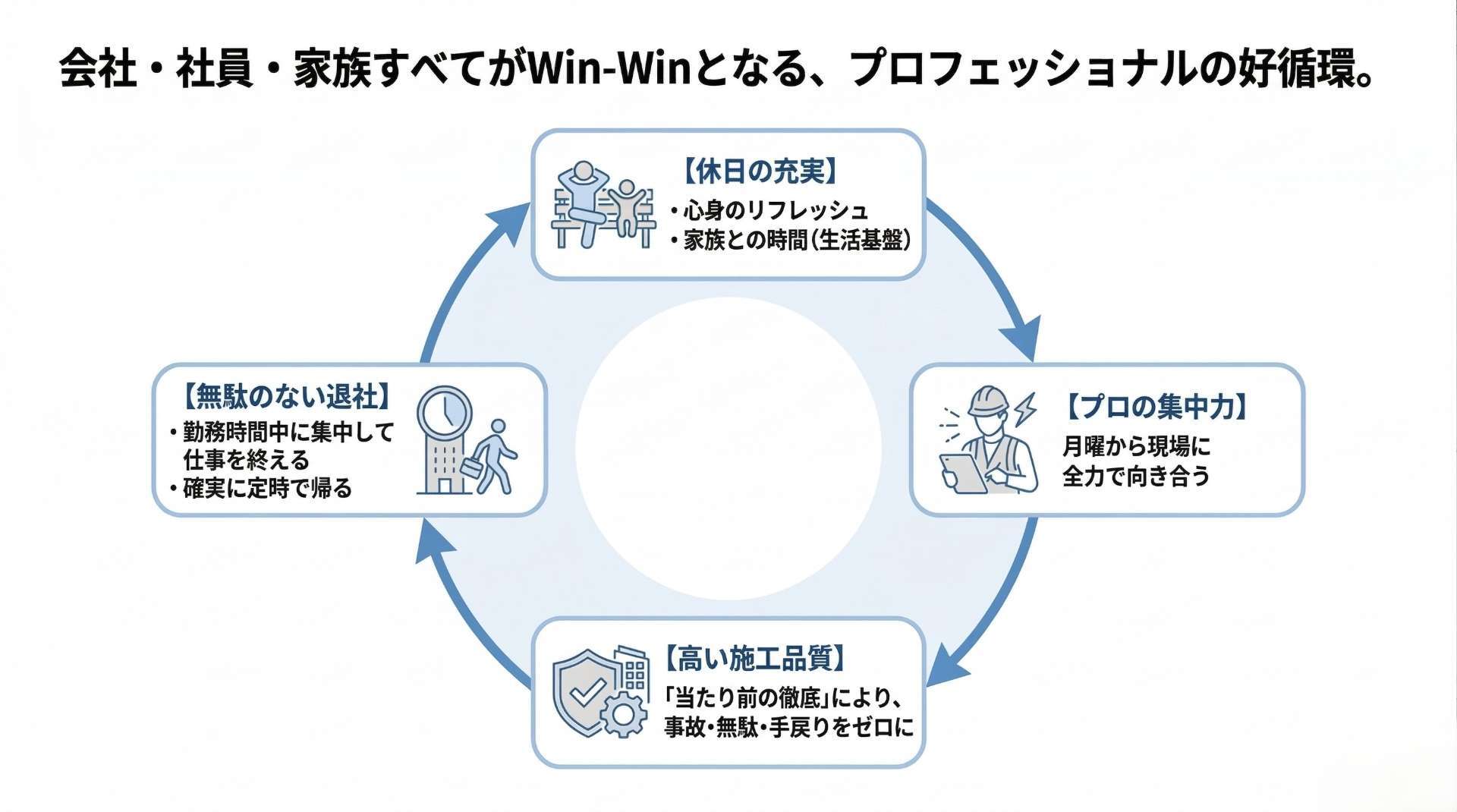 なぜなら、社員が現場で最高のパフォーマンスを発揮し、事故なく安全に業務を終えるためには、プライベートの充実とご家族の支えが不可欠だからです。