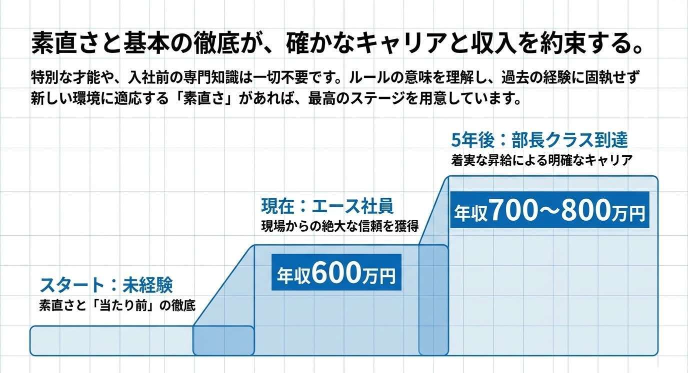 実際に、未経験からスタートし、当社の環境で「当たり前」を徹底的に磨き上げた若手社員は、年収600万円を超えるエースへと成長しました。