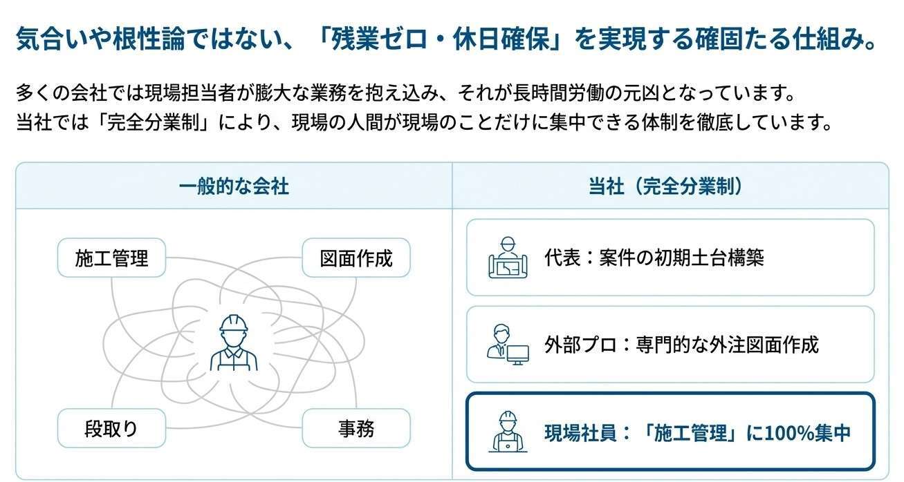 当社が「残業ゼロ・休日確保」を目指せる最大の理由は、気合いや根性論ではなく「完全分業制」という確固たる仕組みがあるからです。